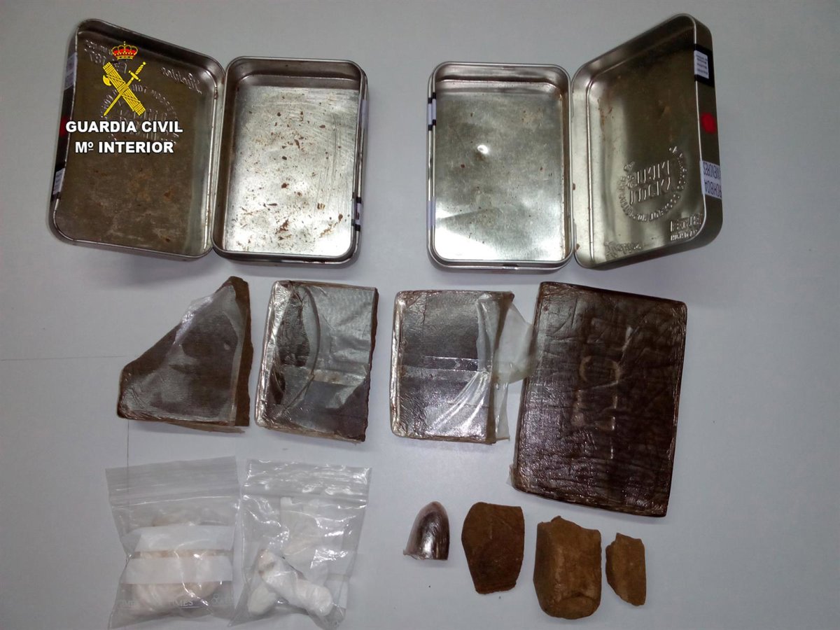 La Guardia Civil ha detenido en la tarde del pasado jueves a un hombre de 44 años, E.S.V., como presunto autor de un delito contra la salud pública al localizarle oculto entre sus ropas hachís, cocaína y éxtasis.