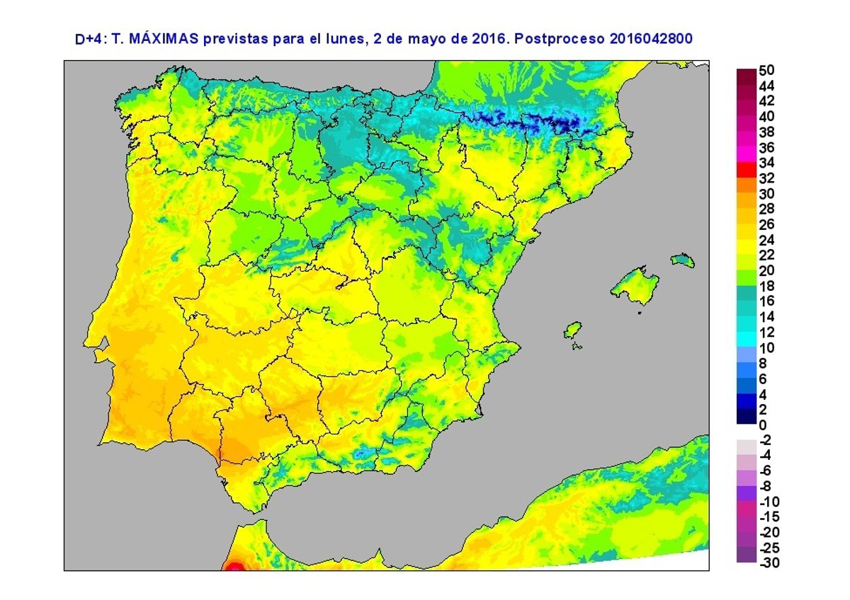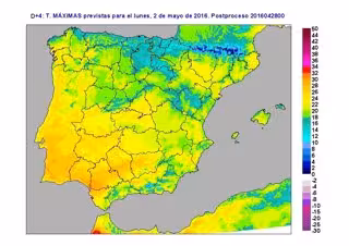 También subirán el lunes las temperaturas "en casi todo el país, sobre todo en el norte de la Península" donde las máximas se acercarán e incluso superarán ampliamente los 20 grados centígrados en algunas zonas. En concreto, en el Cantábrico y norte de Galicia tendrán unos 18 grados centígrados; en el interior de la mitad norte y zonas altas del sistema Central rondarán los 20 grados centígrados y se superará esa temperatura en el interior de la meseta.