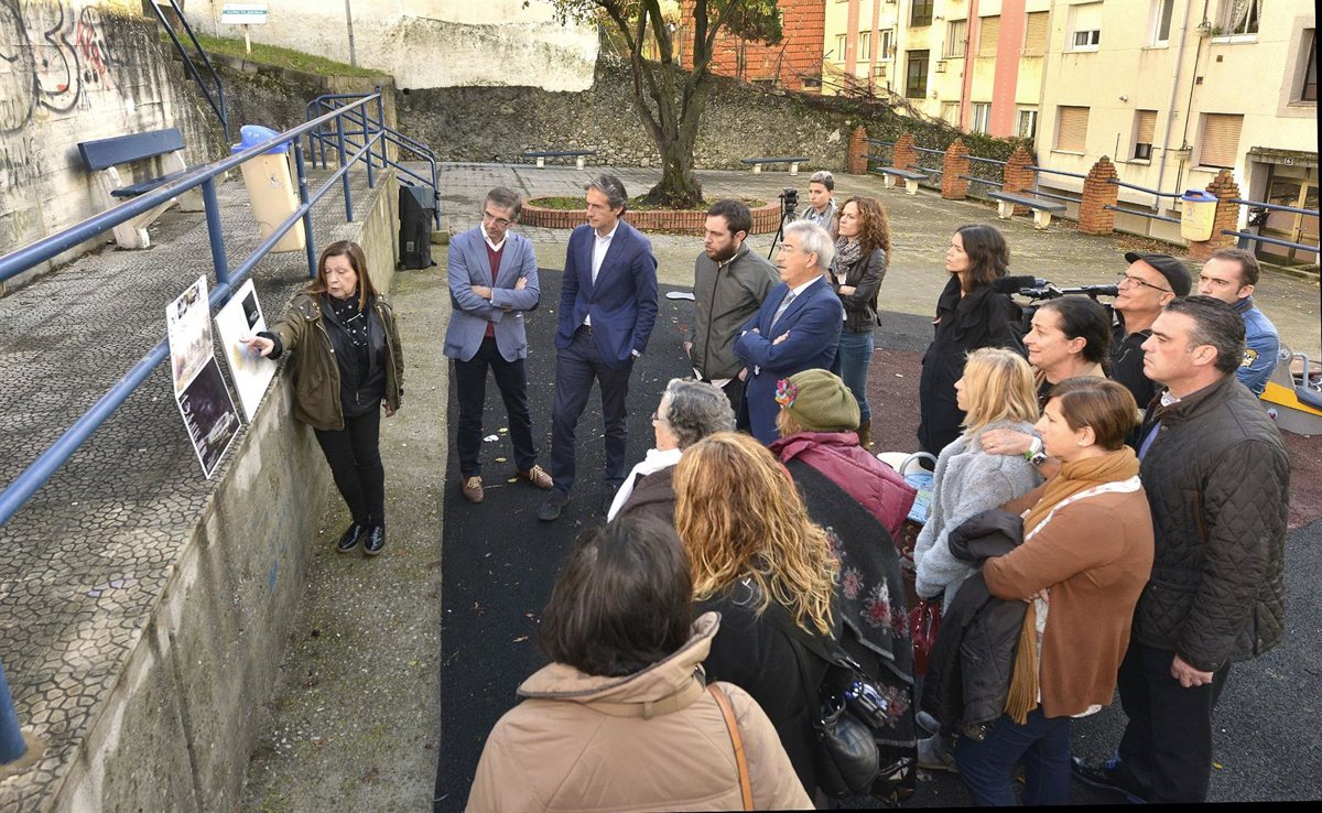 De esta forma, el acceso a la plaza, situada 3 metros por debajo de la rasante de la calle San Sebastián, se resuelve mediante una rampa que se apoya en un muro perimetral de hormigón, que, además, servirá para contener los terrenos adyacentes y servir de soporte a unos bancos.