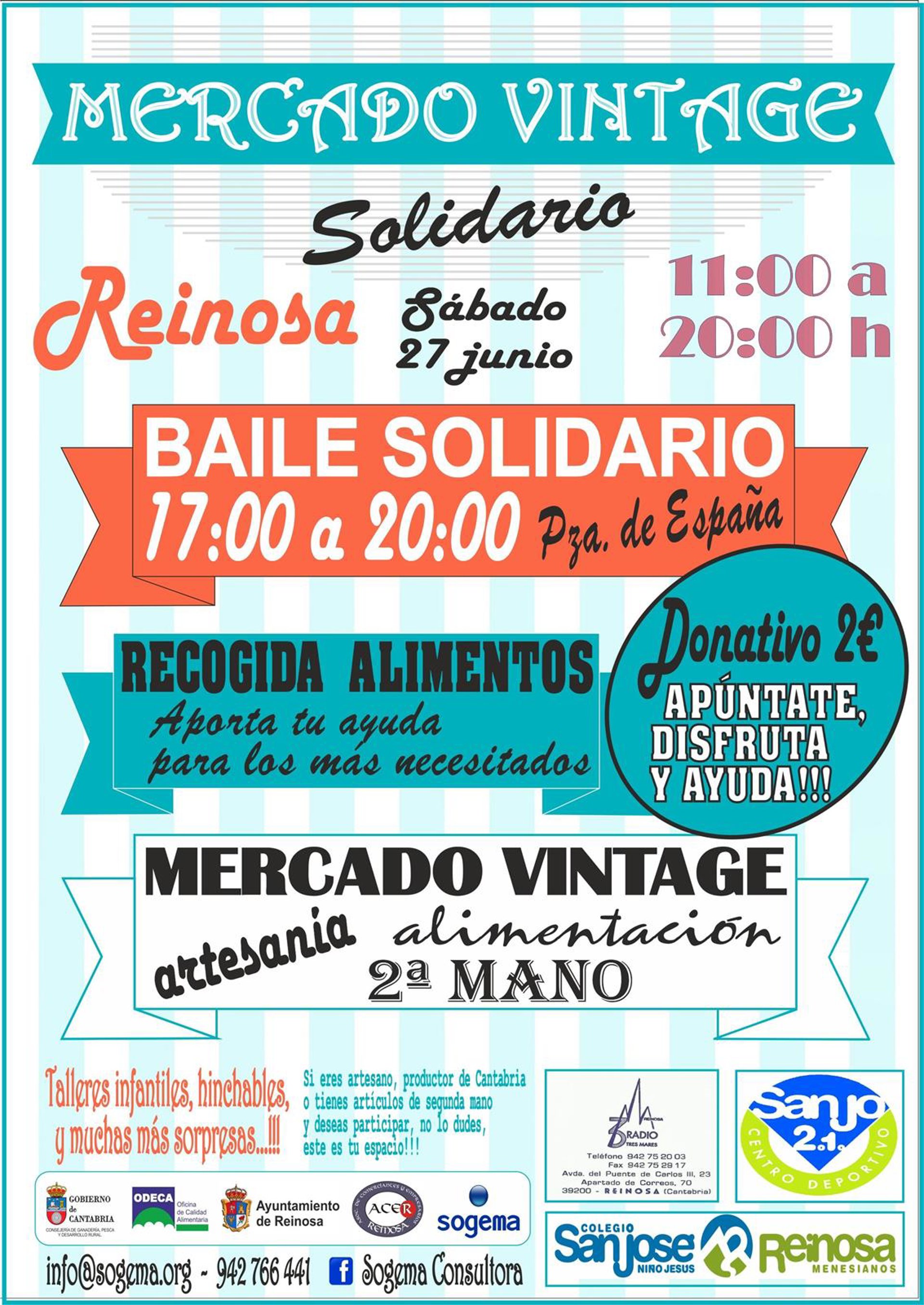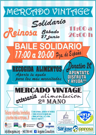 El Mercado Vintage de Reinosa ofrecerá este sábado, 27 de junio, en la Plaza de España su cara más solidaria con una recogida de alimentos no perecederos como leche, galletas, aceite y latas de verduras y la celebración de un baile en el que los dos euros que cuesta la inscripción se destinarán también a familias necesitadas del municipio.