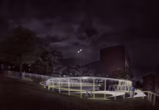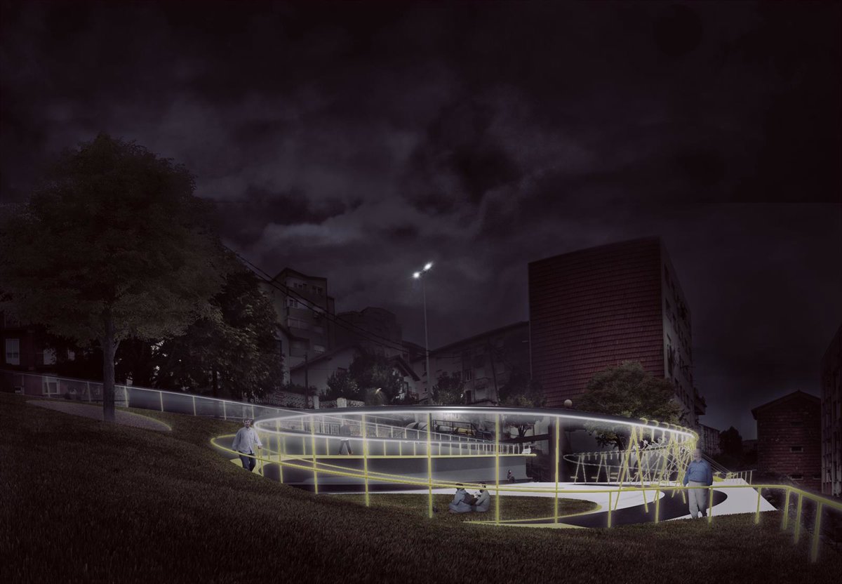 También se diseña, como elemento diferenciador e innovador, un sistema estructural de acero galvanizado que cumplirá las funciones de barandilla de protección a la rampa, dará cabida a la iluminación de la plaza y soportará unos columpios y juegos infantiles para los niños.