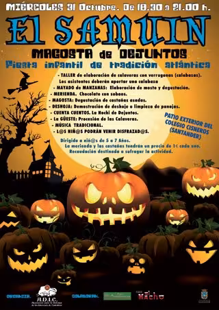 La Asociación para la Defensa de los Intereses de Cantabria (ADIC) celebrará este miércoles, 31 de octubre, de 18.30 a 21.00 horas, en el patio de los colegios Cisneros, Antonio Mendoza y Magallanes de Santander, la segunda edición de 'El Samuin. Magosta de Dejuntos', fiesta infantil tradicional atlántica en la noche de difuntos de Cantabria.