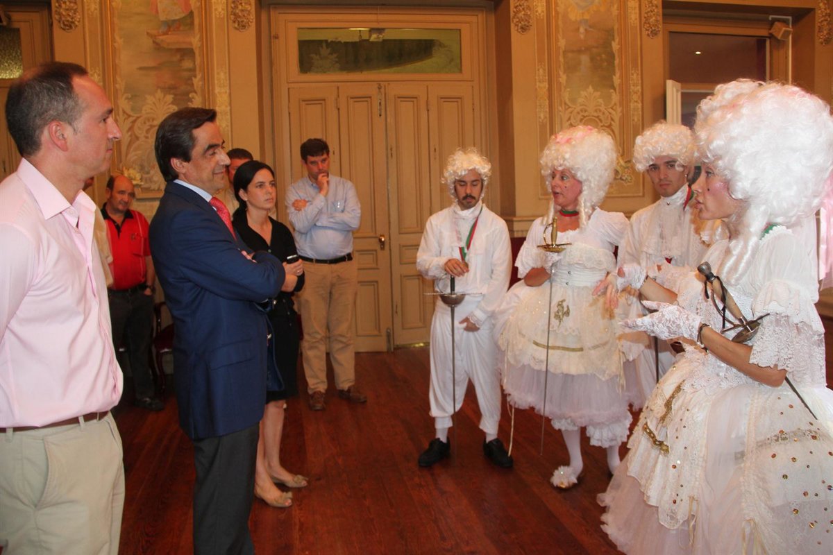 El Salón de Plenos del Ayuntamiento de Torrelavega ha acogido este martes la representación del espectáculo con el que los espadachines de la compañía de esgrima 'Louis XIV' de Torrelavega quedaron terceros del mundo en la modalidad de conjuntos de esgrima artística en el campeonato celebrado en Estoril (Portugal).