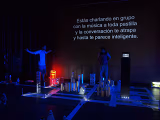 El vídeo, la instalación, los objetos tienen mucho peso en la puesta en escena, generando un dialogo particular dentro de una singular instalación que va ocupando el espacio escénico, dotando de significado a cada uno de ellos. La música ocupa un espacio importante, a partir de la cual se ha construido gran parte de la dramaturgia. Elementos todos ellos que sirven para descubrir una sucesión de momentos trágicos en un lugar en el que se diluye y se oculta el drama.