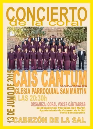 La Coral Voces Cántabras, en colaboración con el Ayuntamiento de Cabezón de la Sal, ha organizado para este sábado, 13 de junio, a partir de las 18.00 horas, el concierto de la coral navarra 'Cais Cantum' que tendrá lugar en la Iglesia Parroquial de San Martín.