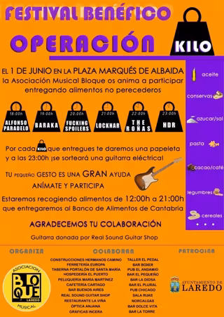 El Festival Benéfico Bloque, organizado por la Asociación Cultural Bloque, se celebrará este sábado, 1 de junio, en Laredo, con un concierto en el que actuarán cinco grupos, a partir de las 18.00 horas, en la plaza Marqués de Albaida, y con una 'operación kilo' en la que se recogerán alimentos.