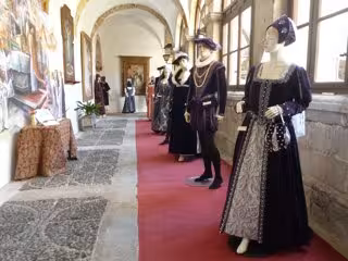 A lo largo de los corredores del claustro se pueden admirar trajes de Caballeros y Damas de la Corte, una nueva colección de trajes de campesinas, soldados, mesoneras, órdenes religiosas, trajes de pequeñas damas y pajes de la Corte e incluso el nuevo traje que lucirá el Emperador Carlos V en la edición 2016 de 'El Último Desembarco de Carlos V'.