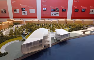 En la muestra se puede contemplar una maqueta central e infografías del edificio, una línea de tiempo, audios, videos, folletos y una webcam que permite al visitante introducirse en la obra.