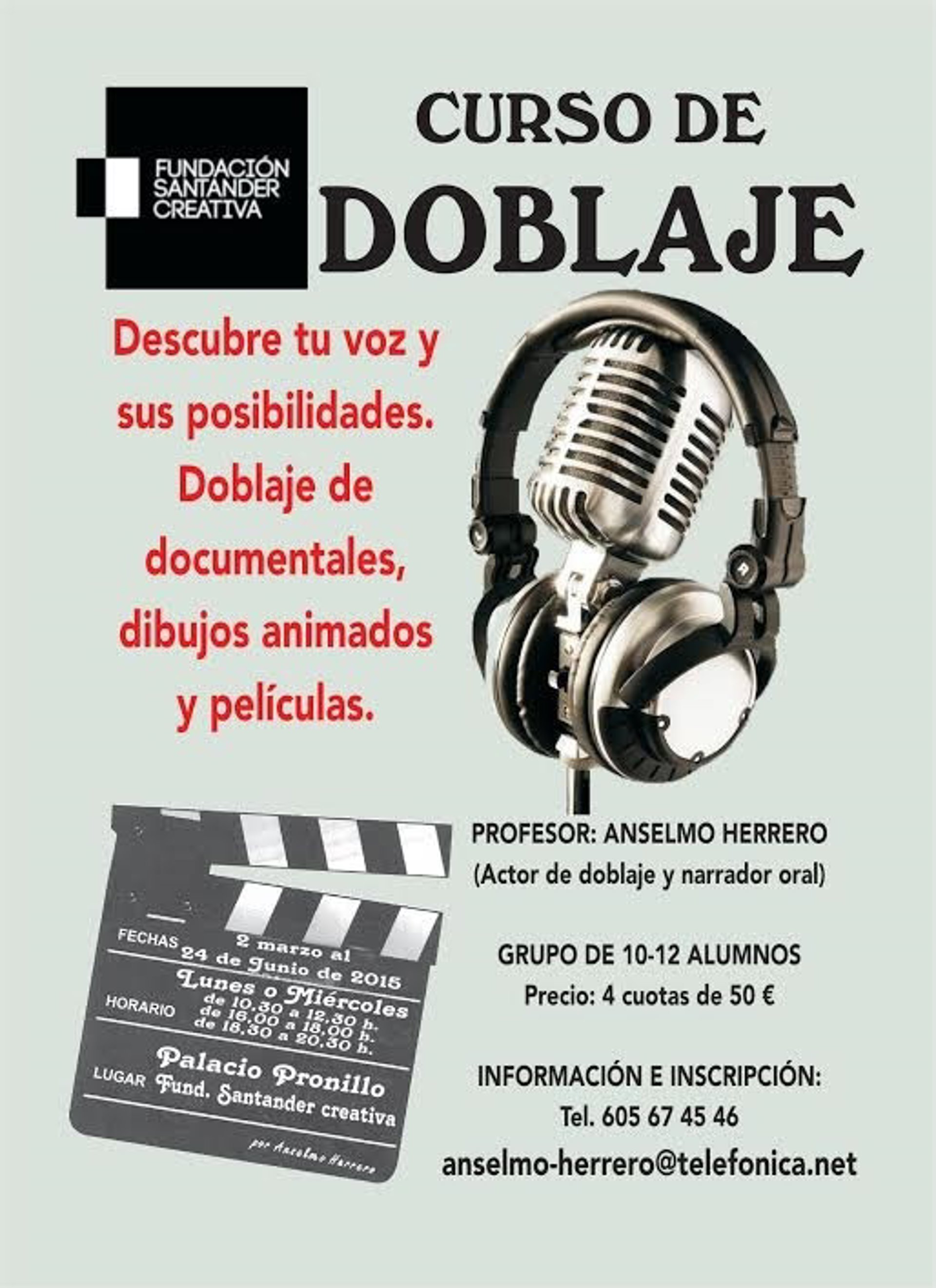 Adentrarse en el universo de los actores de doblaje aprendiendo las principales técnicas para trabajar con la voz es uno de los objetivos de la cuarta edición del curso de iniciación al doblaje que acogerá Enclave Pronillo, sede de la Fundación Santander Creativa (FSC), a partir del próximo marzo. Hasta ahora, han participado más de 100 personas.