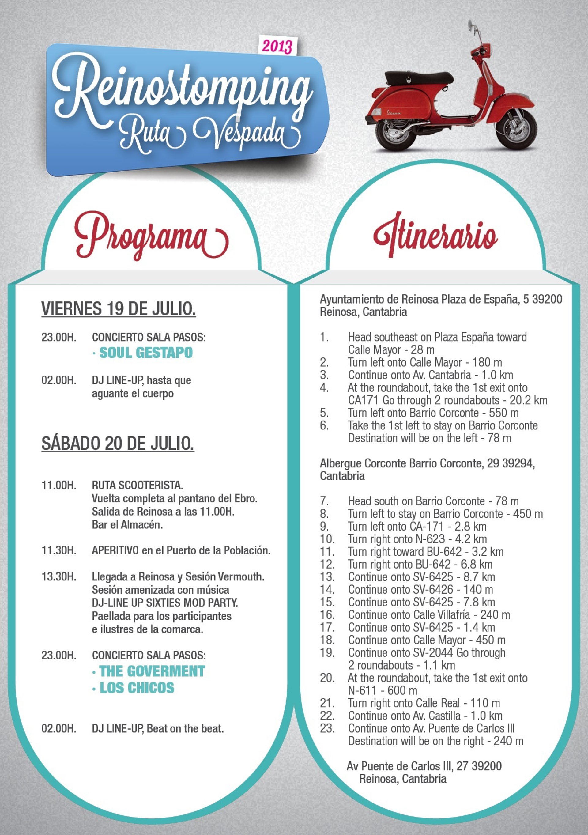 Paralelo a los conciertos, el día 20 se ha organizado una ruta en scooters que partirá, a las 11.00 horas, del bar El Almacén y recorrerá los principales pueblos en torno al pantano del Ebro. A la hora del vermouth se repondrán fuerzas con una paella para los participantes, amenizada por una sesión de música Mod-Garajera.