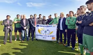De la Serna ha hecho entrega al entrenador racinguista, Paco Fernández, de la bandera de Santander como Ciudad Europea del Deporte 2014 "para que se sume, a lo que, desde el Ayuntamiento, pretendemos que sea una gran celebración del deporte durante todo el año".