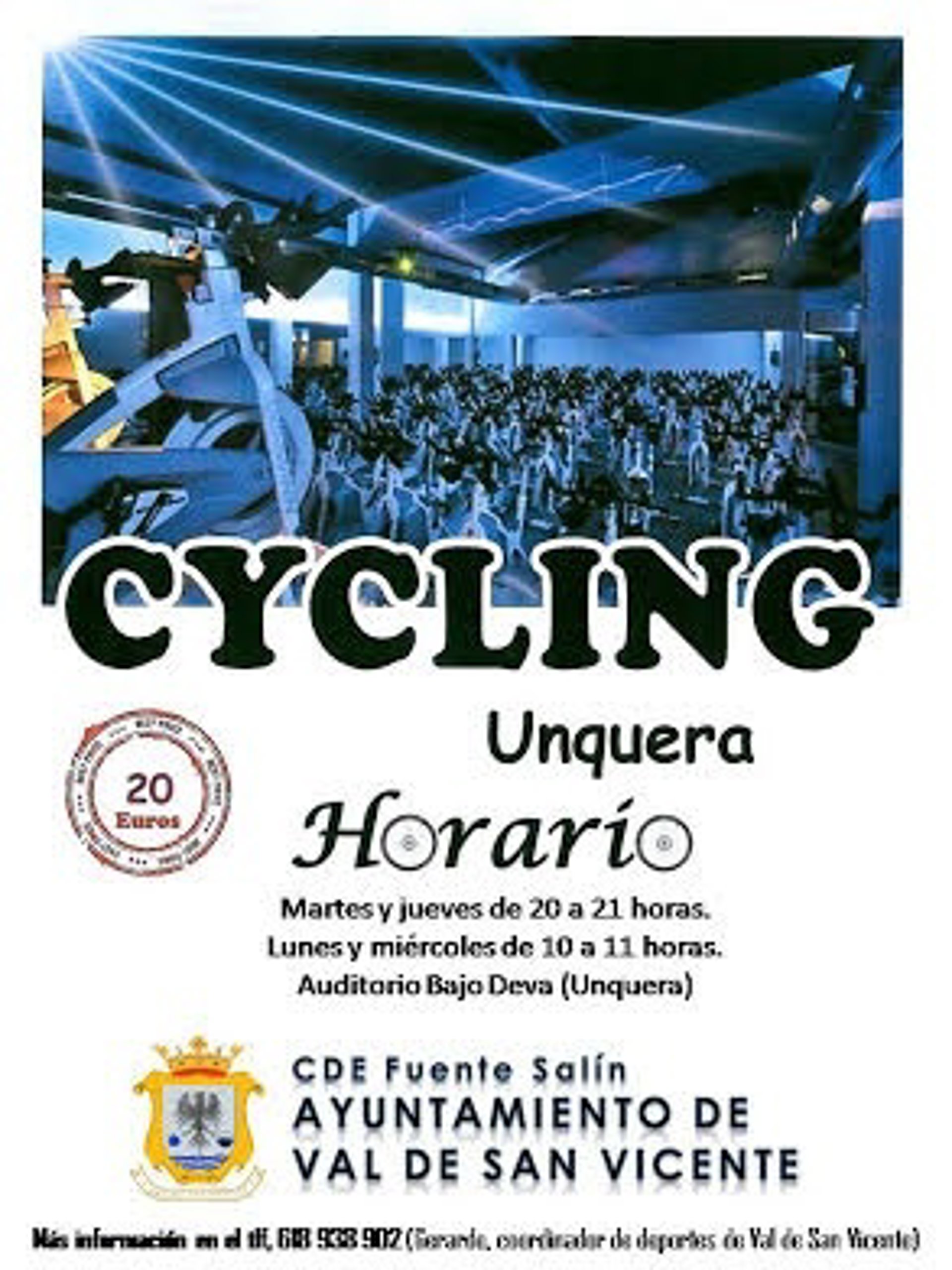 El Club Deportivo Fuente Salín en colaboración con el Ayuntamiento de Val de San Vicente pone en servicio por segundo año consecutivo, clases de spinning en el aula multiusos de la planta baja del Auditorio Municipal Bajo Deva. Las clases se impartirán los martes y jueves a partir de las 20.00 horas y lunes y miércoles a las 10.00 horas.