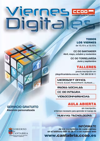 CC.OO. de Cantabria iniciará el próximo 13 de abril los 'Viernes digitales', una nueva actividad formativa dirigida a facilitar de forma gratuita a todos los ciudadanos que lo deseen el acceso y conocimiento de las nuevas tecnologías de la información.