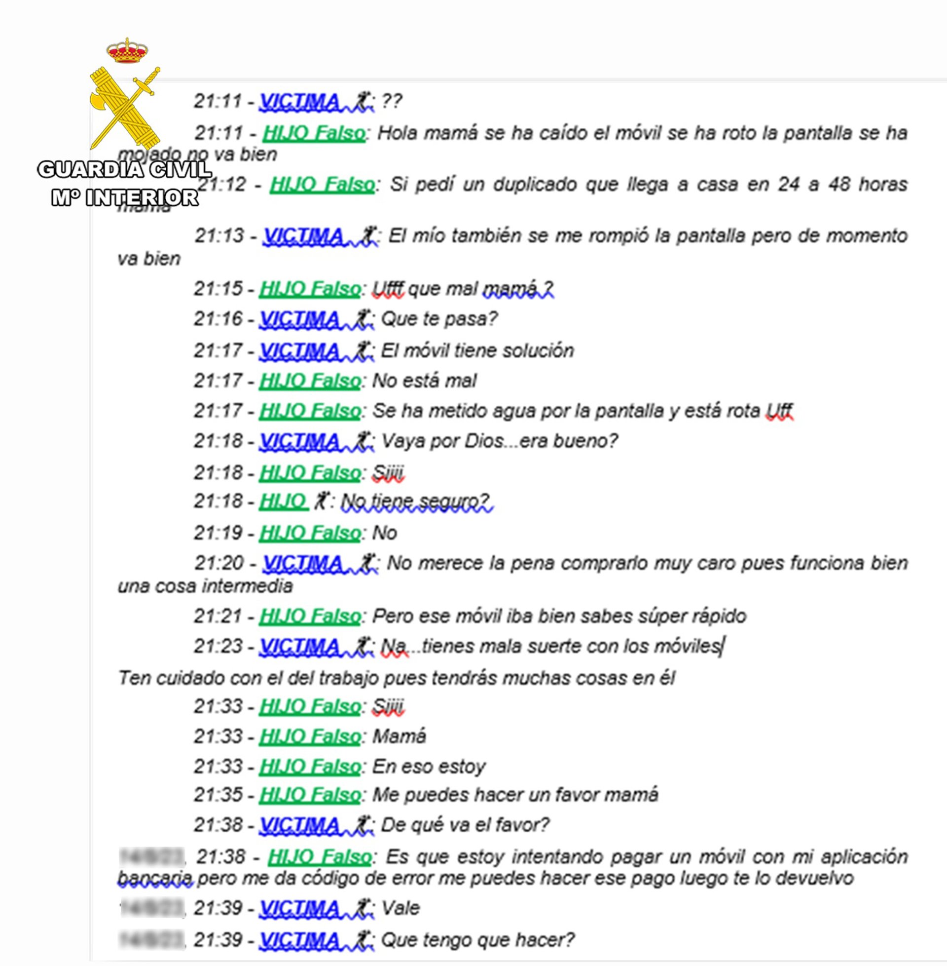 Ganada la confianza, el ciberdelincuente expuso problemas graves de familia y económicos que debía resolver con urgencia, comenzando así las víctimas a realizar transferencias para ayudar al que creían su hijo, hasta que se dieron cuenta de que era una estafa. El dinero se transfirió a seis cuentas diferentes.