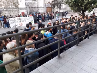 A las puertas de los juzgados situados en la calle Alta aguardaban cerca de dos centenares de personas, incluidos familiares de los acusados y estudiantes convocados por el Colectivo de Estudiantes de Cantabria (ColEst) y el Frente de Estudiantes en "solidaridad" con los siete jóvenes, puesto que el supuesto escrache se produjo en la Universidad de Cantabria (UC) en febrero de 2014.