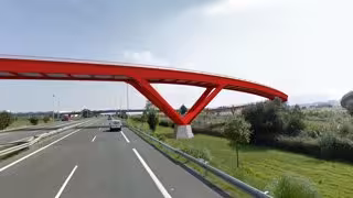 La longitud total de pasarela mixta es de 106 metros, y el apoyo principal central tiene forma de V reduciendo la luz efectiva en los vanos principales de la pasarela a unos 29 metros. Una losa de hormigón de canto de hasta 13 cm, descansa sobre la estructura metálica de la pasarela.
