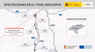 El Ministerio de Transportes y Movilidad Sostenible cortará desde este martes --a las 7 de la mañana-- el tráfico entre los kilómetros 172 y 176 de la A-67 en sentido a Santander a la altura del túnel de Riocorvo, en Cartes, que "previsiblemente" no se reabrirá al tráfico hasta el viernes 17 de octubre.