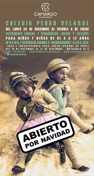 El Ayuntamiento de Camargo abre este lunes el plazo de inscripción en el programa de conciliación familiar 'Abierto por Navidad', que atiende a niños de entre tres y 12 años, desde el 24 de diciembre hasta el 4 de enero en horario de 9 a 14 horas, mientras sus familias trabajan.