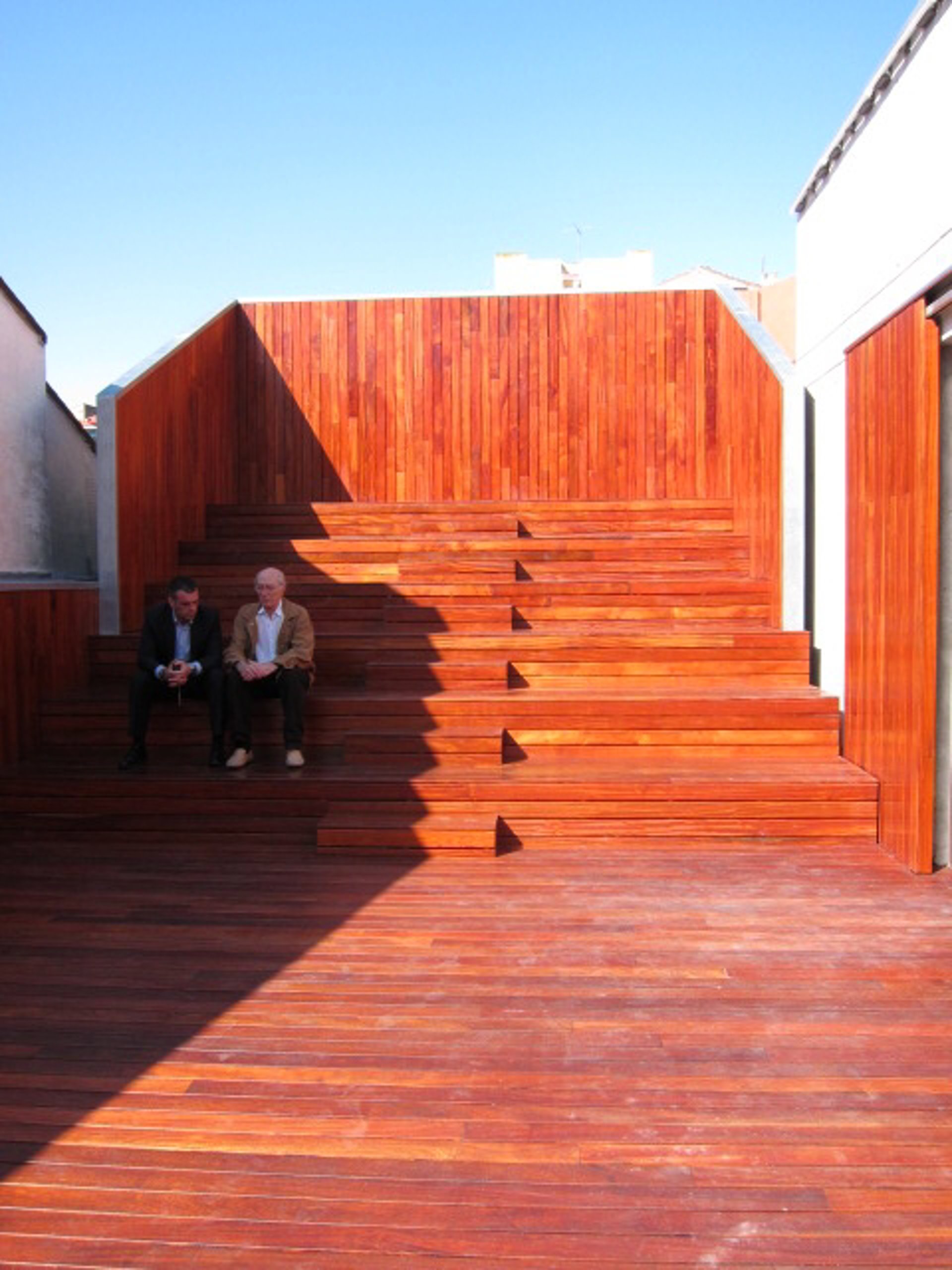 La cubierta alberga la principal singularidad del edificio y que será su seña de identidad ya que se ha habilitado la cubierta como una zona totalmente accesible con un pequeño auditorio para desarrollar actos al aire libre, utilizando un acabado en madera tanto para el suelo como para las paredes interiores.
