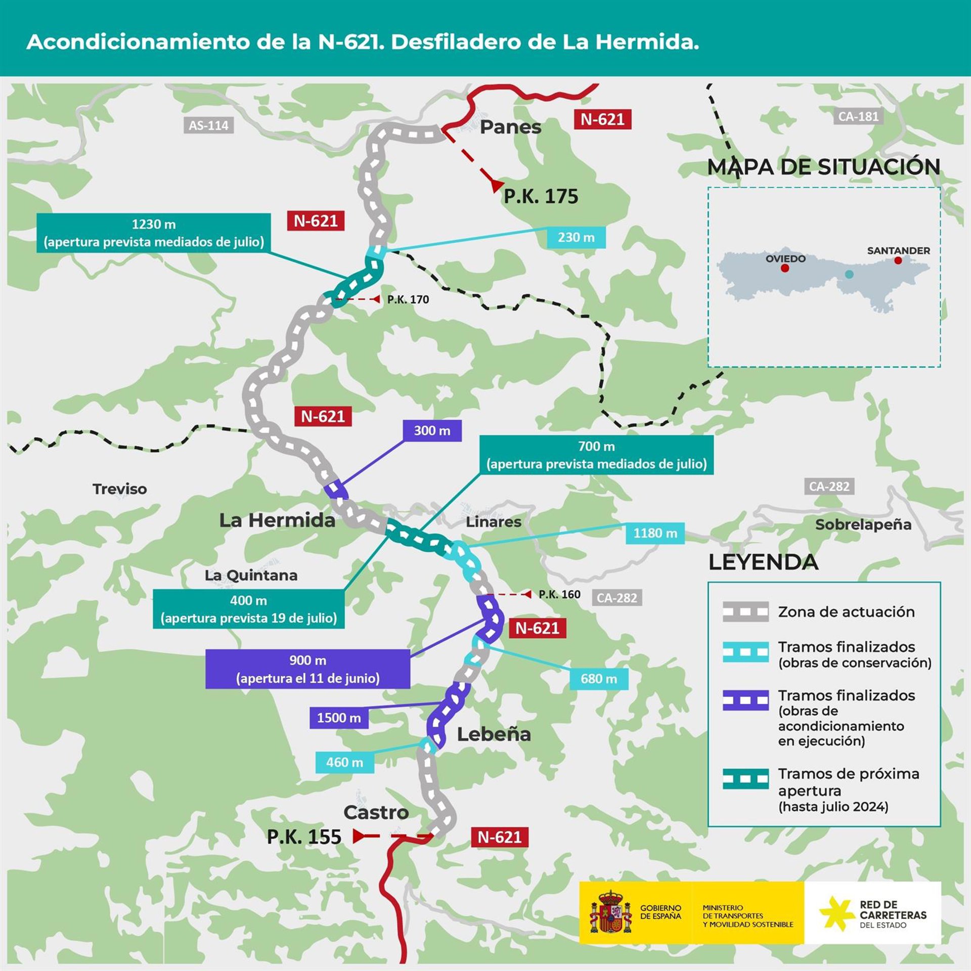 El Ministerio de Transportes y Movilidad Sostenible abre al tráfico dos nuevos tramos acondicionados de la carretera N-621 en el Desfiladero de la Hermida, entre Cantabria y Asturias, en el marco de las obras para la mejora de la plataforma y tratamiento ambiental de esta vía.