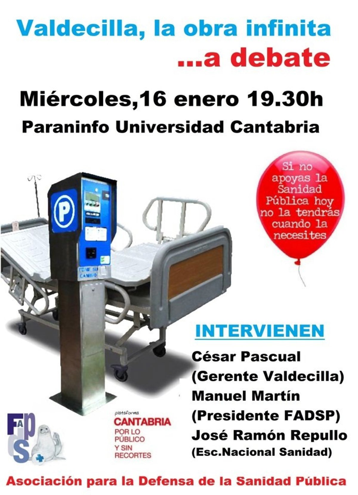 El debate, apoyado por la Plataforma Cantabria Por Lo Público Y Sin Recortes, contará con la participación de César Pascual, gerente del Hospital Valdecilla; Manuel Martín, presidente de la Federación de Asociaciones en Defensa de la Sanidad Pública; y José Ramón Repullo, jefe del Departamento de Planificación y Economía de la Salud de la Escuela Nacional de Sanidad.