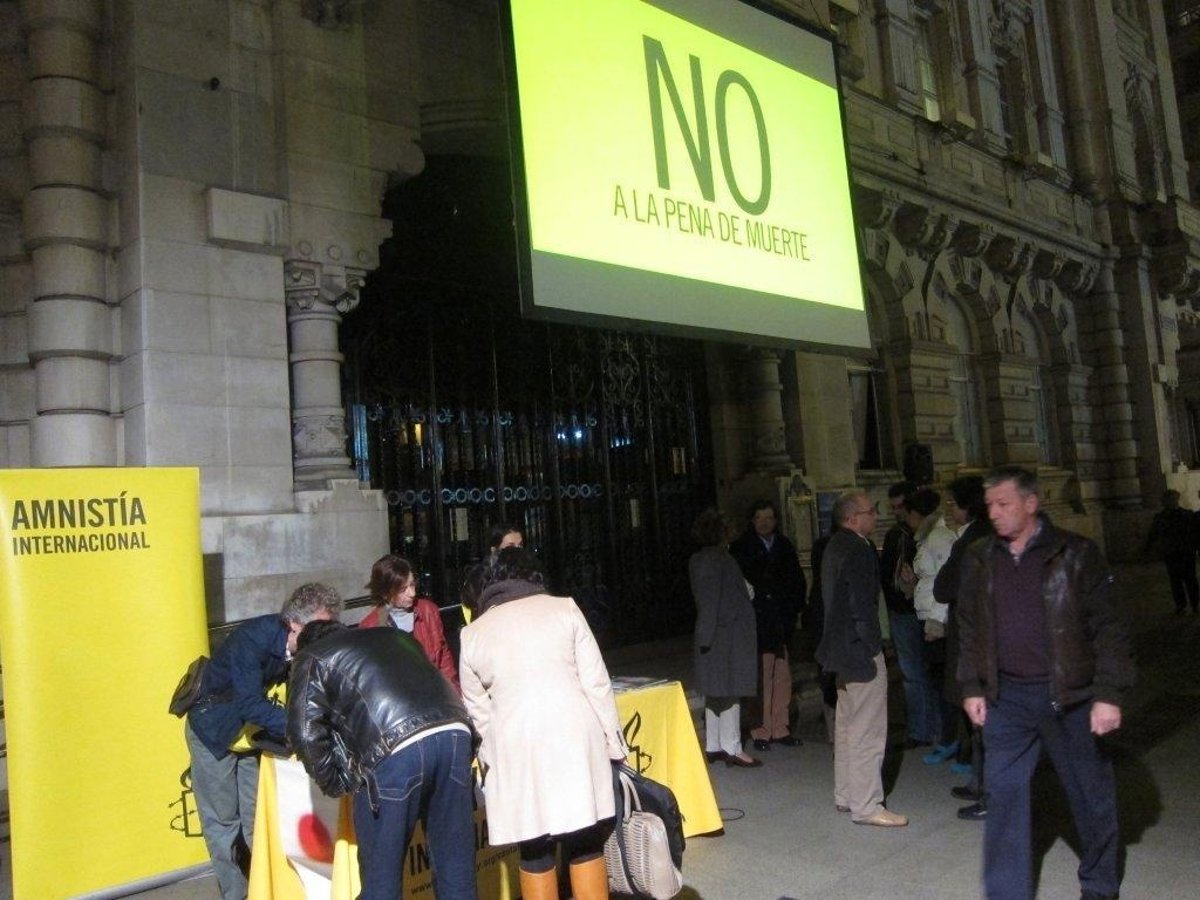 Amnistía Internacional ha celebrado este miércoles un acto contra la pena del muerte en la Plaza del Ayuntamiento de Santander, en cuya fachada se han proyectado imágenes alusivas a esta causa.