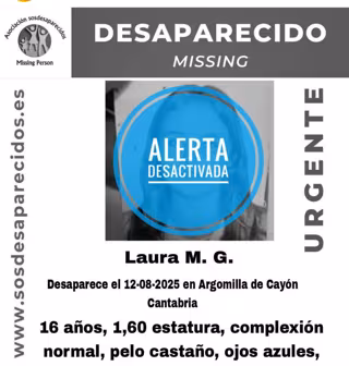 Cartel con la alerta desactivada tras aparecer la menor de 16 años desaparecida en Argomilla de Cayón (Santa María de Cayón) - SOS DESAPARECIDOS