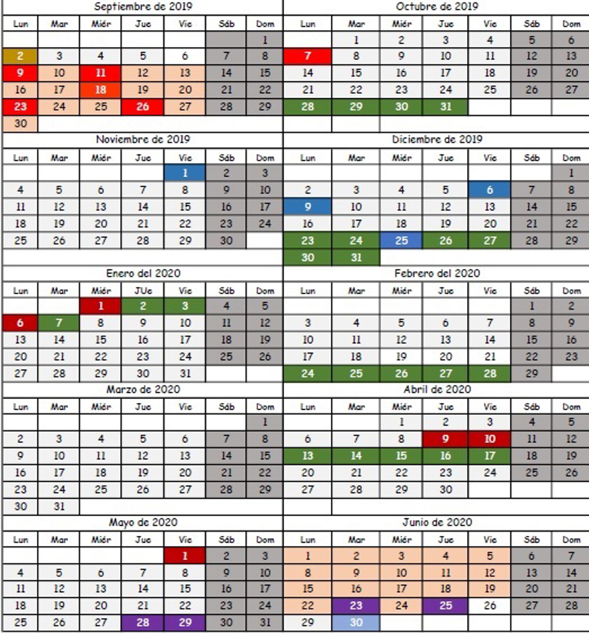 El resto del calendario comprende periodos no lectivos del 28 de octubre al 3 de noviembre; el 6 y 9 de diciembre; las vacaciones de Navidad, del 23 de diciembre al 7 de enero; del 24 de febrero al 1 de marzo; las vacaciones de Semana Santa, del 9 de abril al 19; y el viernes 1 de mayo.