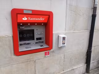 Dispensador de gel hidroalcohólico junto a un cajero automático de una banco - AYTO