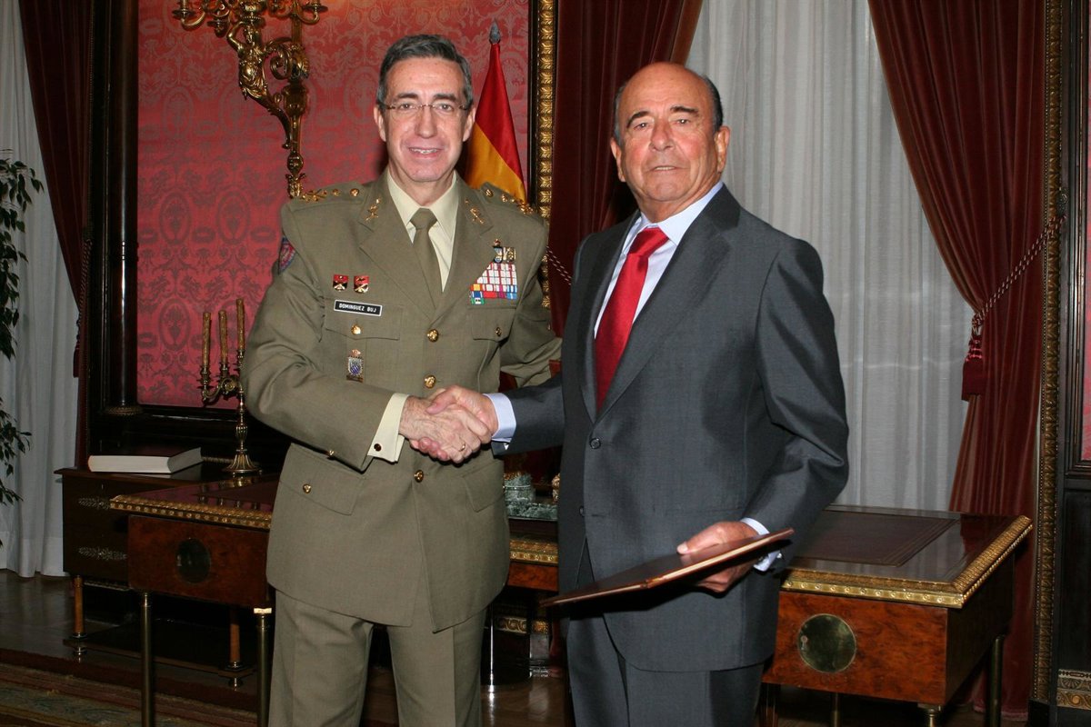 El presidente del Banco Santander, Emilio Botín, y el jefe del Estado Mayor del Ejército de Tierra (JEME), general Jaime Domínguez Buj (en representación del Ministerio de Defensa), han rubricado el acuerdo en el Palacio de Buenavista de Madrid, sede del Cuartel General del Ejército.