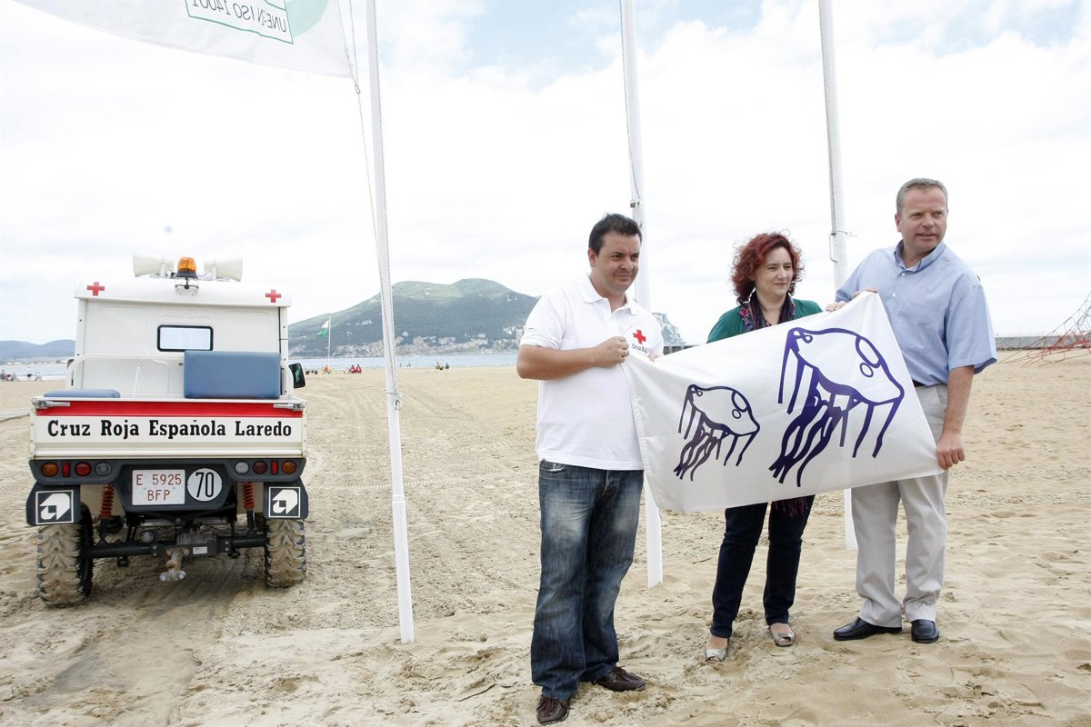 El titular del departamento y responsable autonómico de Protección Civil, Vicente Mediavilla, ha entregado este jueves una de las banderas al servicio de Salvamento y Socorrismo de la playa Salvé, en Laredo. En concreto, se entregarán 92, una por cada puesto de socorrismo.