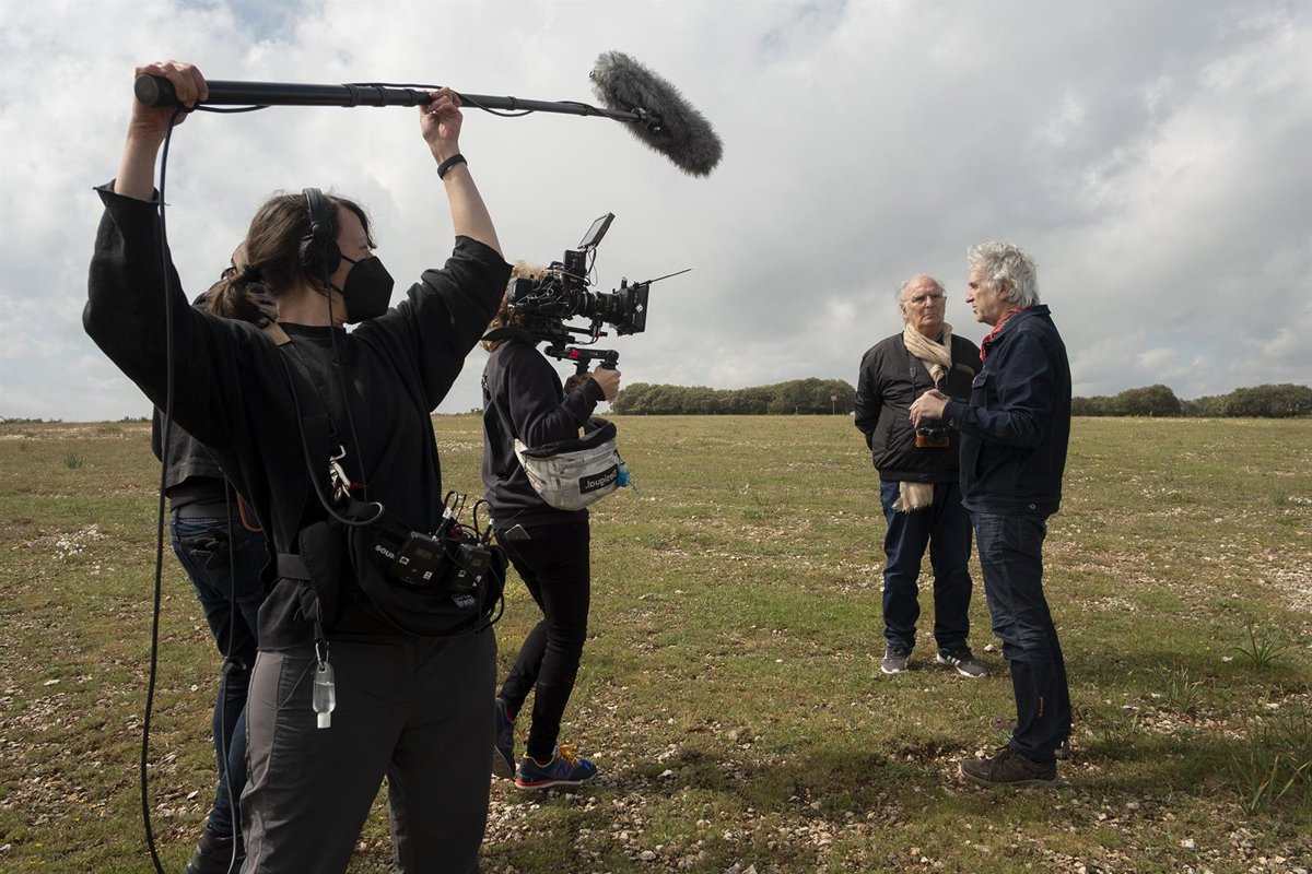 Archivo - Carlos Saura conversa con Juan Luis Arsuaga durante el rodaje de 'Las paredes hablan'. - ÓSCAR ORENGO/FLAMINGO COMUNICACIÓN - Archivo