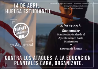 El Bloque Estudiantil de Cantabria-Frente de Estudiantes se sumará este miércoles y jueves, 13 y 14 de abril, a la huelga de convocada por el Sindicato Estudiantil a nivel nacional y además organizará el jueves una manifestación en Santander.