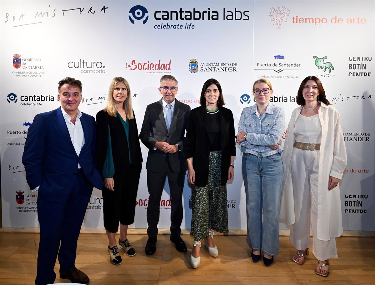La directora de Tiempo de Arte, Merche Zubiaga; la directora de comunicación y marca de Cantabria Labs, Bolola Lana; el director general del Grupo GOF, Andrés Gómez Bueno; la alcaldesa de Santander, Gema Igual; el presidente de la Autoridad Portuaria de Santander (APS), César Díaz; y la directora general de Cultura, Eva Guillermina Fernández, han presentado el proyecto este jueves en rueda de prensa, en la que se ha proyectado un vídeo del colectivo Boa Mistura, quienes no han podido acudir al acto.