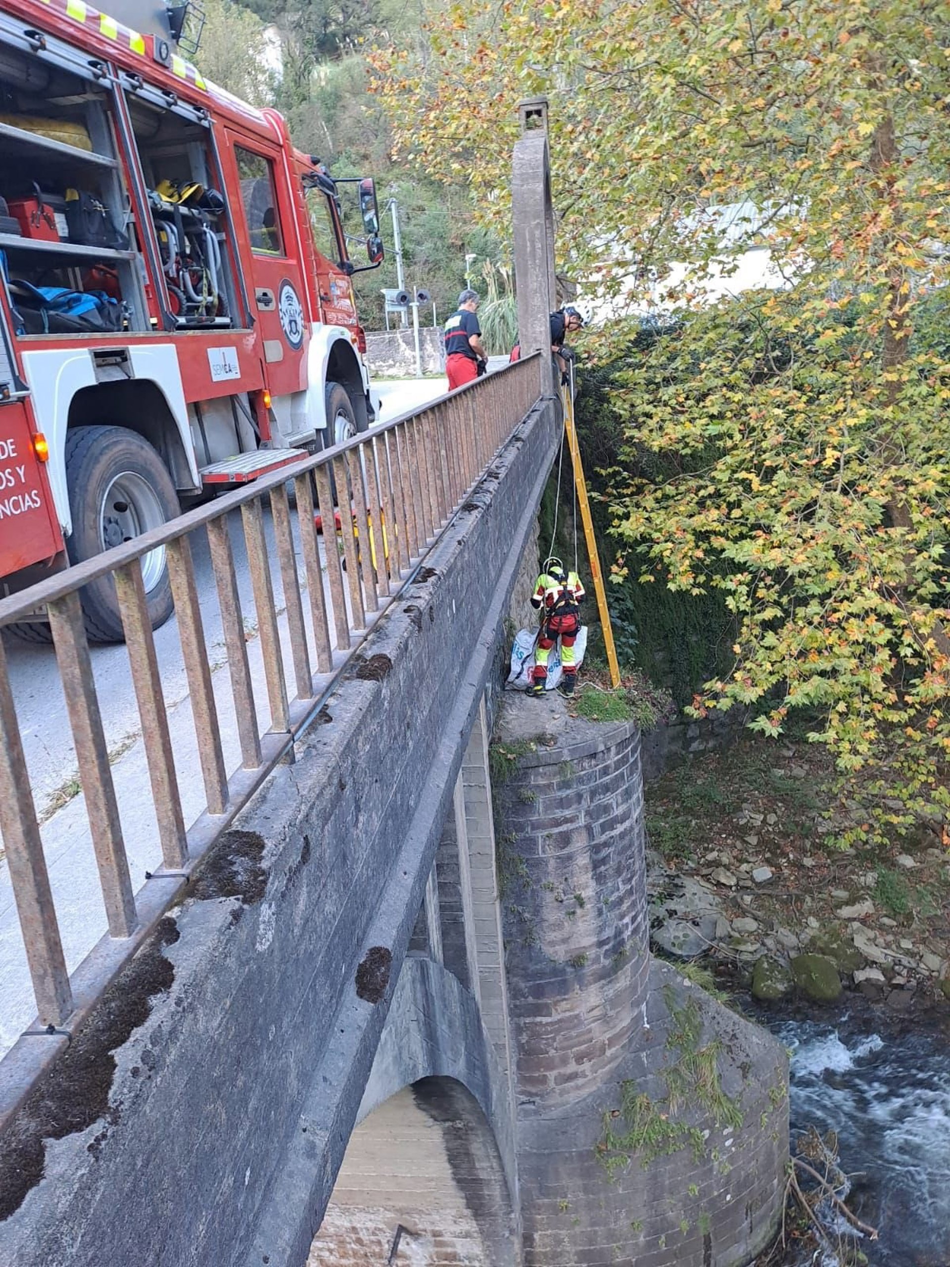Bomberos del Gobierno de Cantabria han rescatado este sábado a un perro que se encontraba atrapado en una de las pilastras del puente de Las Caldas del Besaya, en el municipio de Los Corrales de Buelna.