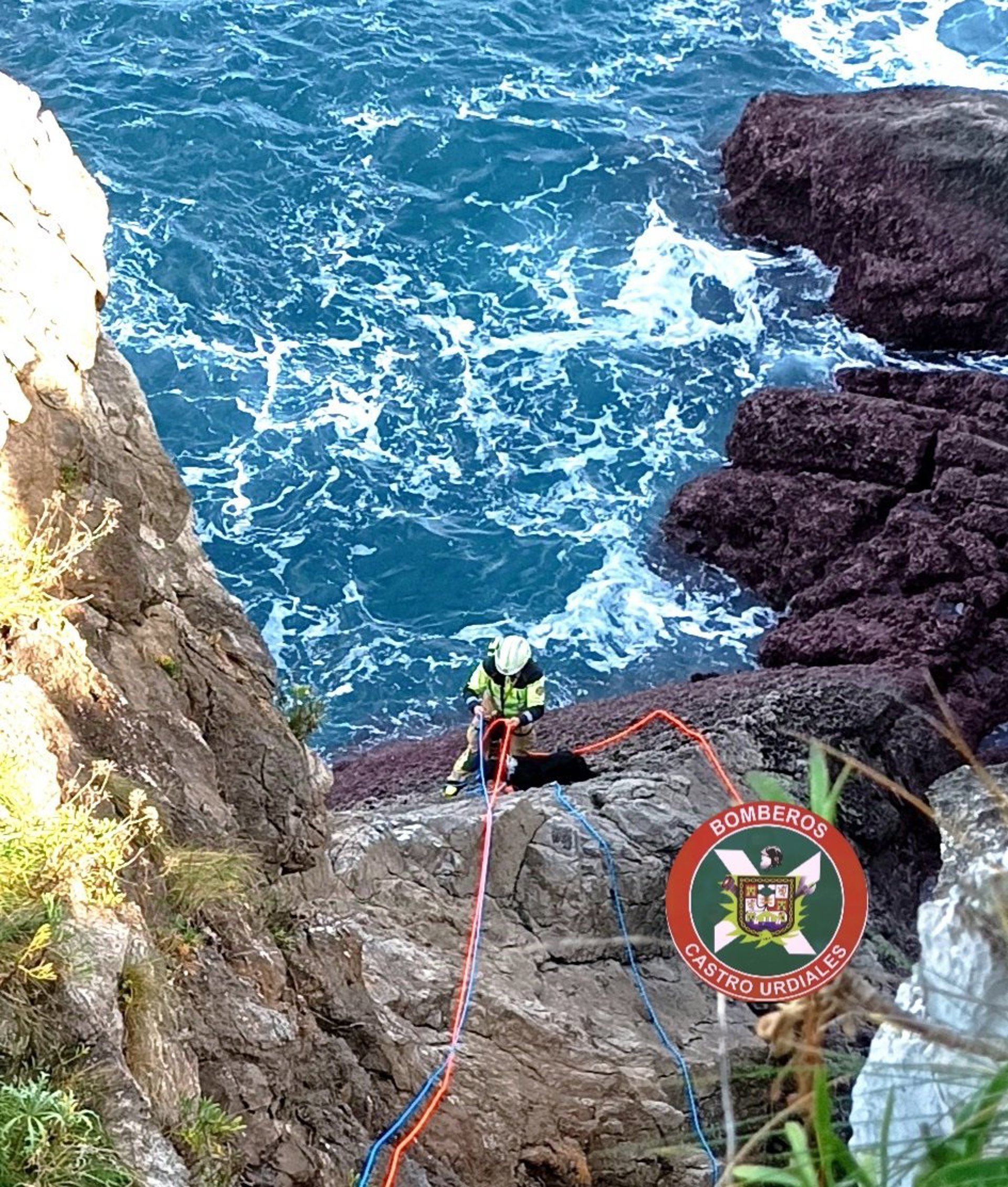 Bomberos del Ayuntamiento de Castro Urdiales han rescatado este sábado a un perro que había caído al mar por el acantilado de Cotolino, en dicha localidad.