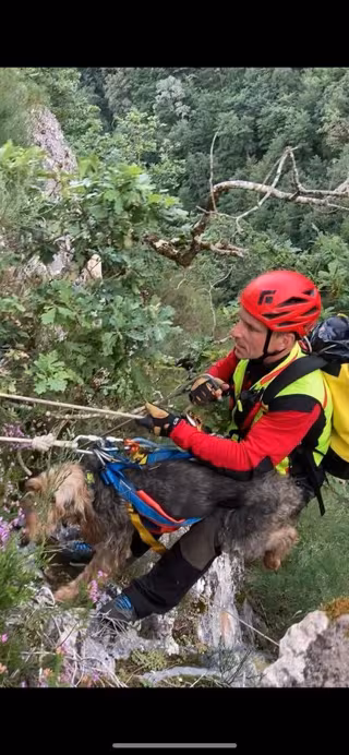 Los Bomberos del Gobierno de Cantabria han rescatado este jueves en Tudanca a un perro que estaba en una repisa de una pared vertical de 100 metros.