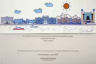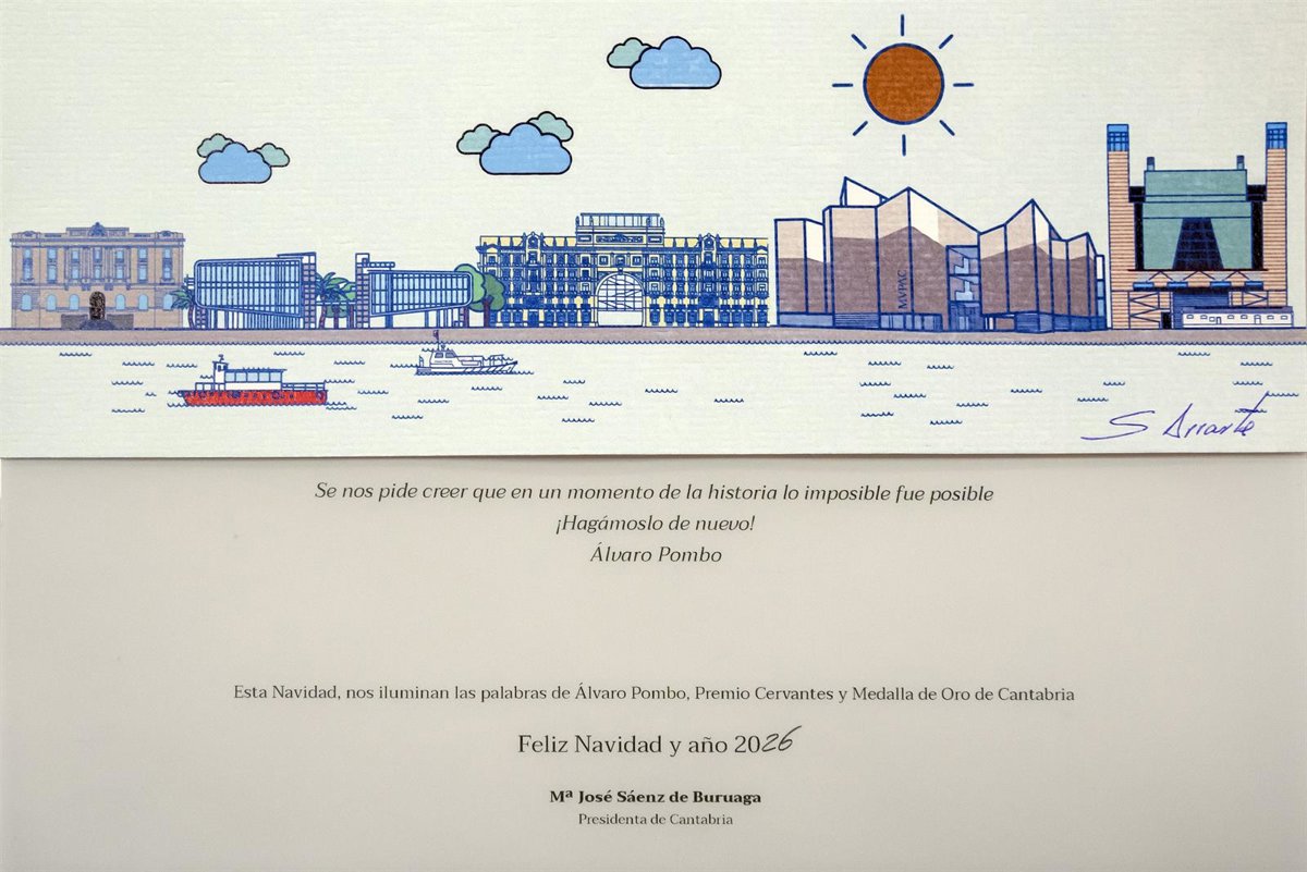 La presidenta de Cantabria, María José Sáenz de Buruaga, felicita este año la Navidad con una obra de Santiago Arrarte, que plasma los grandes proyectos culturales de la región que serán realidad en 2026, y con una frase creada para la ocasión por el premio Cervantes y Medalla de Oro de Cantabria, Álvaro Pombo, con la que llama a encarar el futuro de Cantabria con optimismo.