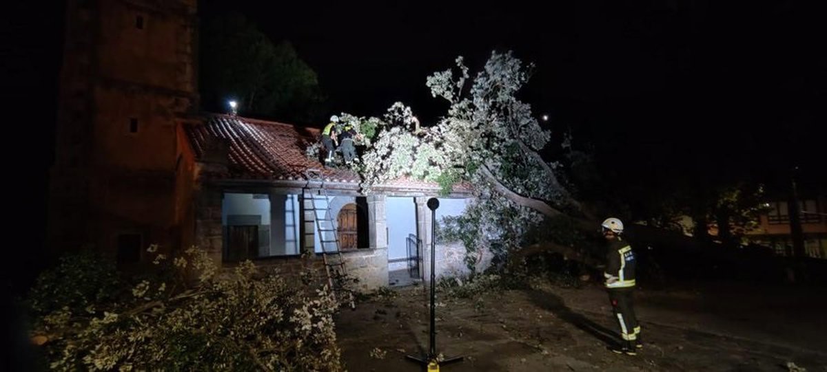 Según informa el Centro de Atención a Emergencias de Cantabria 112, los bomberos del Gobierno regional tuvieron que trocear el árbol para ir liberando de peso de la infraestructura y poder retirarlo.