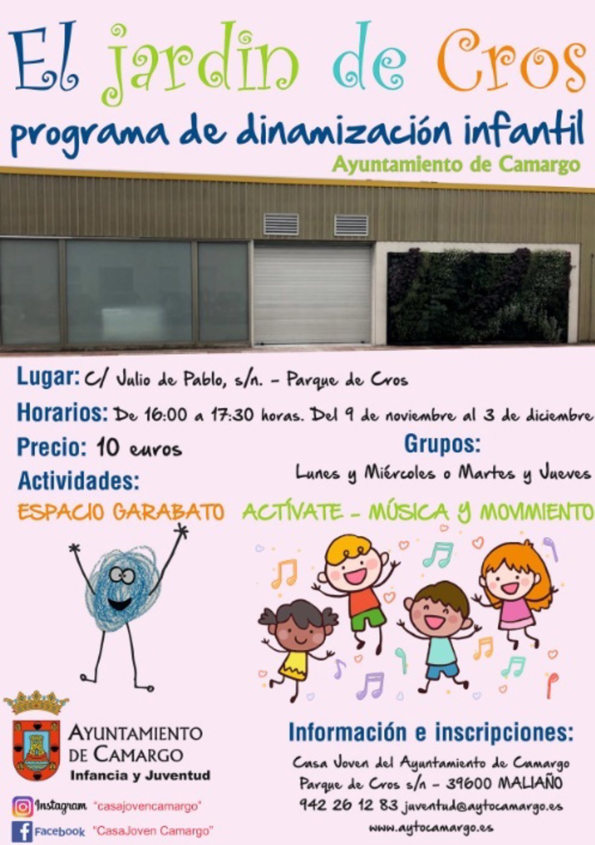 La Concejalía de Infancia y Juventud del Ayuntamiento de Camargo celebrará del 9 de noviembre al 3 de diciembre el programa de actividades 'El Jardín de Cros', dirigido a niños de 3 a 6 años, que se llevará a cabo en horario de tarde.