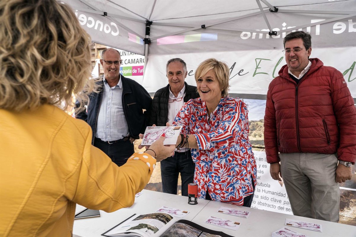 La alcaldesa de Camargo, Esther Bolado, acompañada por el concejal de Turismo, Eugenio Gómez, el presidente de la Federación Filatélica de Cantabria, Constantino Ruiz, y el presidente de la Red Cántabra de Desarrollo Rural y secretario del Itinerario Cultural de Arte Rupestre del Consejo de Europa, Leoncio Carrascal, han dado a conocer estos elementos que servirán para promocionar la imagen de Camargo y El Pendo a través del servicio postal.