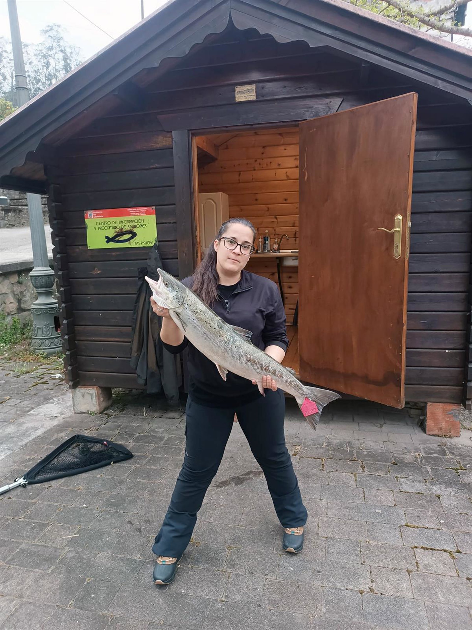Destacados restaurantes pujarán por hacerse con este primer salmón, un ejemplar de 5.380 gramos de peso, 82 centímetros de talla y 39 de circunferencia, que fue capturado ayer, a las 8.45 horas, por la pescadora cántabra de Ramales de la Victoria Nekane Arias Da Silva en el río Pas, en concreto, en la zona del Pozo La Central de Puente Viesgo.