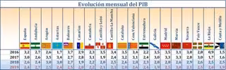 Murcia se sitúa como la región más dinámica en 2019, con un avance previsto del 3%. Tras ellas se situarían Andalucía (2,7%), Comunidad Valenciana (2,6%), Aragón (2,5%), Baleares (2,5%), Madrid (2,5%) y País Vasco (2,5%). Con un crecimiento estimado igual a la media nacional se encuentran las regiones de Asturias y Extremadura. Por debajo de esta media se sitúa el resto de regiones, con avances de entre el 1,9% y el 2,3%, entre ellas Cantabria (2,2%).