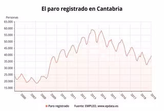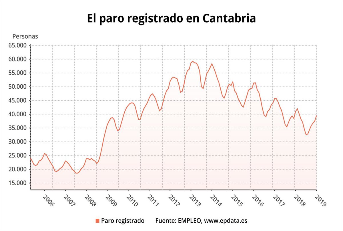 El número de parados registrados en las oficinas de empleo en Cantabria subió en 2.003 personas en enero, lo que supone un 5,3% más que en diciembre de 2018, el mayor incremento por comunidades y frente a un repunte medio del 2,6%.