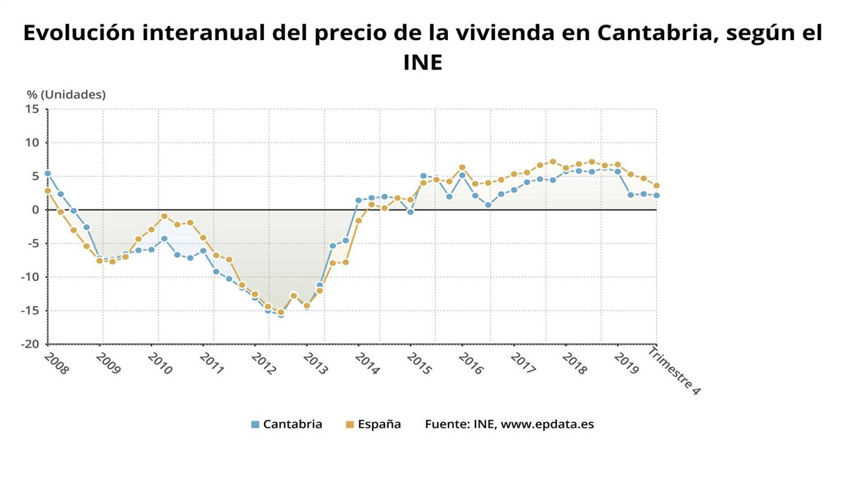El precio de la vivienda subió en Cantabria un 2,1% en el cuarto trimestre 2019 en relación al mismo periodo del año anterior, el menor incremento de todas las comunidades y dos puntos menos de la media nacional que se incrementó un 4,1%, según el Índice de Precios de Vivienda (IPV) del Instituto Nacional de Estadística (INE) publicado este martes.
