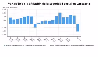 Sin embargo, en términos interanuales Cantabria registró un incremento de afiliados del 0,29%, correspondiente a 618 personas, en contraposición con el descenso del -0,19% en toda España.