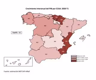 En el caso de la tasa intertrimestral, esto es en comparación con el trimestre anterior (el cuarto de 2019), la caída de media del PIB en España ha sido del 5,2 por ciento mientras que en Cantabria se estima un descenso del 5,3%, igual que el estimado para Aragón, Comunidad de Madrid y Galicia.