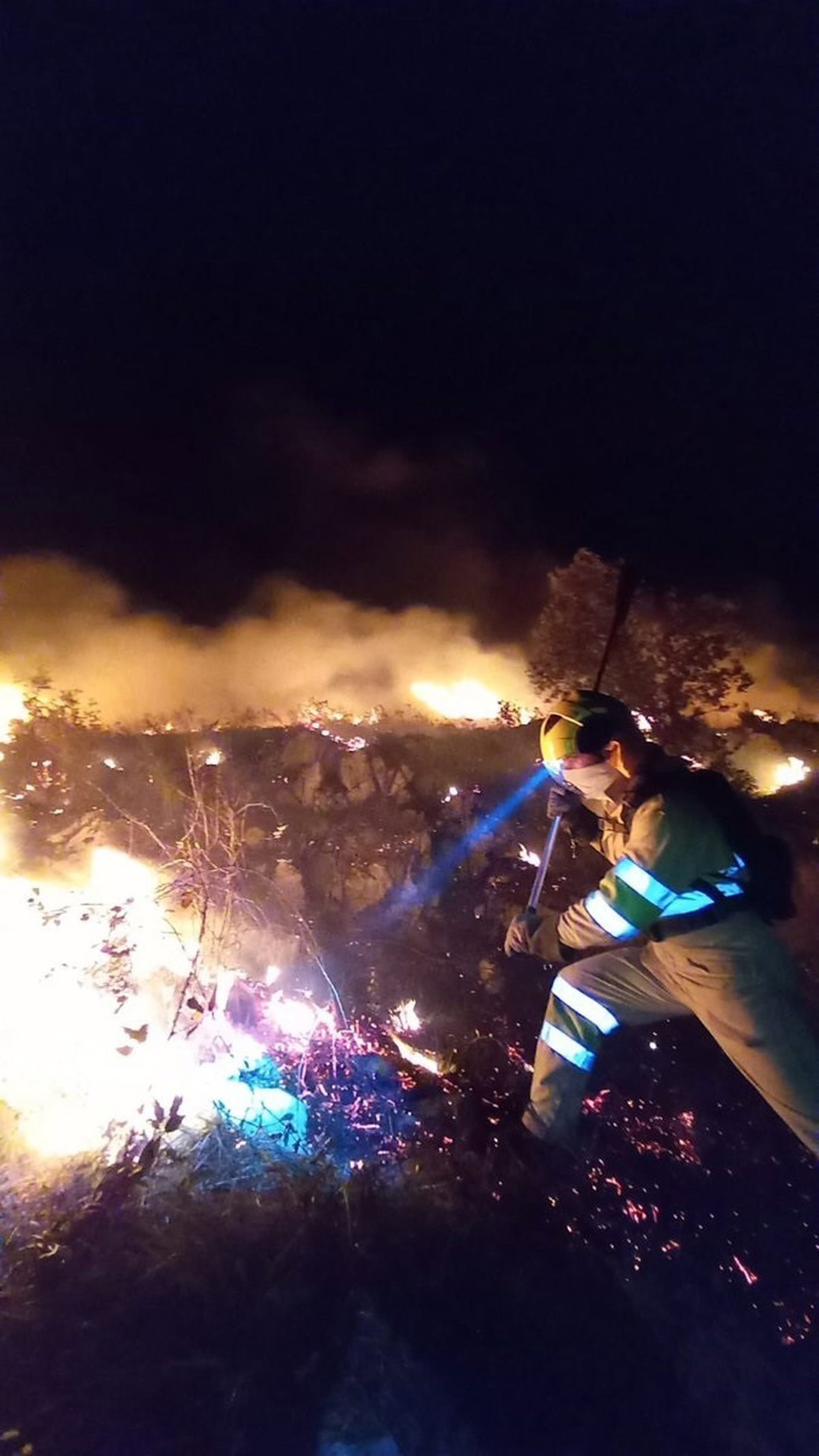 Un efectivo trata de sofocar las llamas de un incendio forestal - X 112