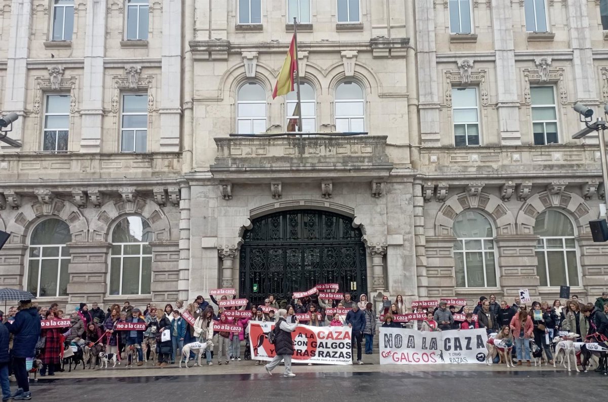 Un centenar de personas se ha concentrado este domingo en la Plaza del Ayuntamiento de Santander para protestar contra la actividad cinegética y denunciar el "abandono" que sufren los perros de caza, en especial, los galgos.