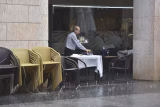 Archivo - Un camarero recoge una mesa en una terraza mientras llueve - Verónica Lacasa - Europa Press - Archivo
